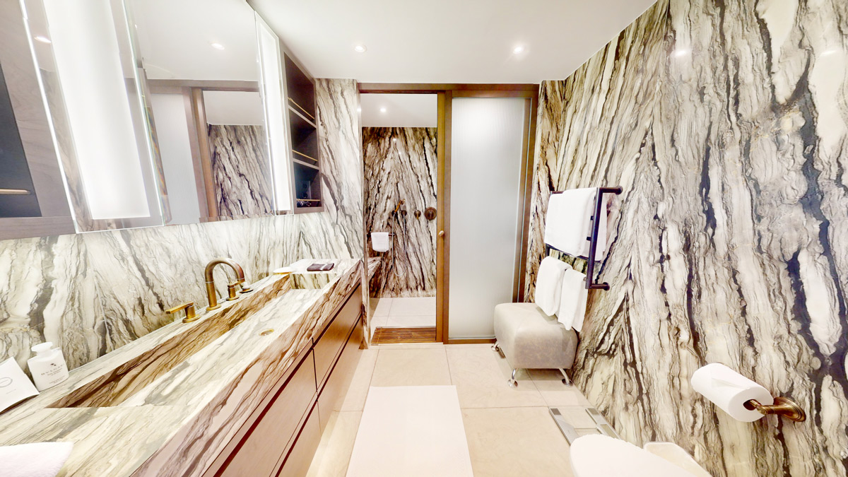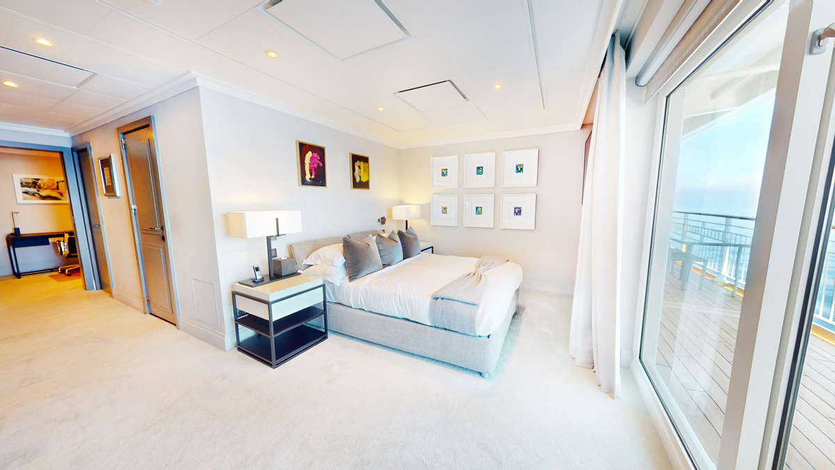 Make this sleek Ocean Residence your Home at sea. Upon entering, step into a main living area brought to life with vibrant colors and the clean lines of modern design elements, all lit by the sun pouring through floor-to-ceiling sliding glass doors. Crossing this threshold, a private veranda awaits where you can sip your morning coffee and watch the sun vault over the horizon. Within, an expansive study with elegant writing desks provides another retreat where you can reflect on your international adventures. When entertaining Guests, invite them to dine at a table with seating for six and delight them with your thrilling discoveries while on-board chefs prepare a gourmet meal in the Residence’s kitchen, complete with sprawling marble counters and state-of-the-art appliances. As the sun sets, welcome Guests to enjoy the luxuries of their own bedroom, which include built-in wall-to-wall closets, an en suite bath, and veranda access (a coveted rarity among the Ship’s Guest accommodations). Then retire to your primary bedroom, with its own veranda access, vast built-in closet space, en suite bath, and king-size bed. It is the perfect place to rest and rejuvenate in preparation for all the days of breathtaking explorations ahead of you aboard The World.